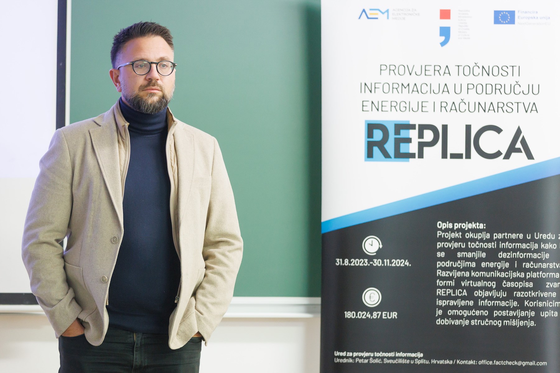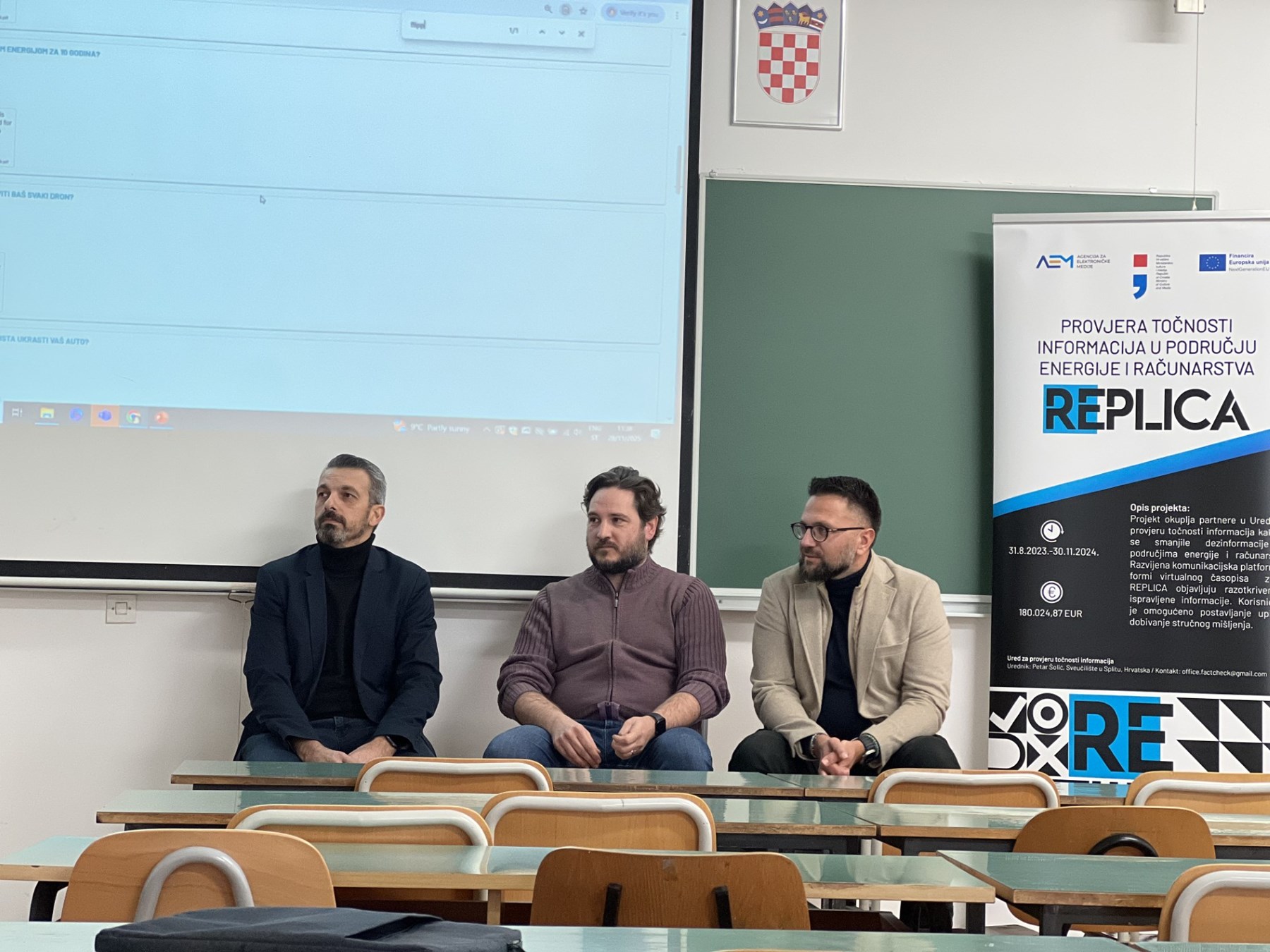 Voditelj projekta, izv. prof. dr. sc. Petar Šolić, otvorio je događanje predstavljanjem ciljeva i funkcionalnosti platforme. Projekt REPLICA okuplja tim stručnjaka u okviru Ureda za provjeru točnosti informacija, s glavnom misijom: smanjiti širenje dezinformacija na području energije i računarstva.