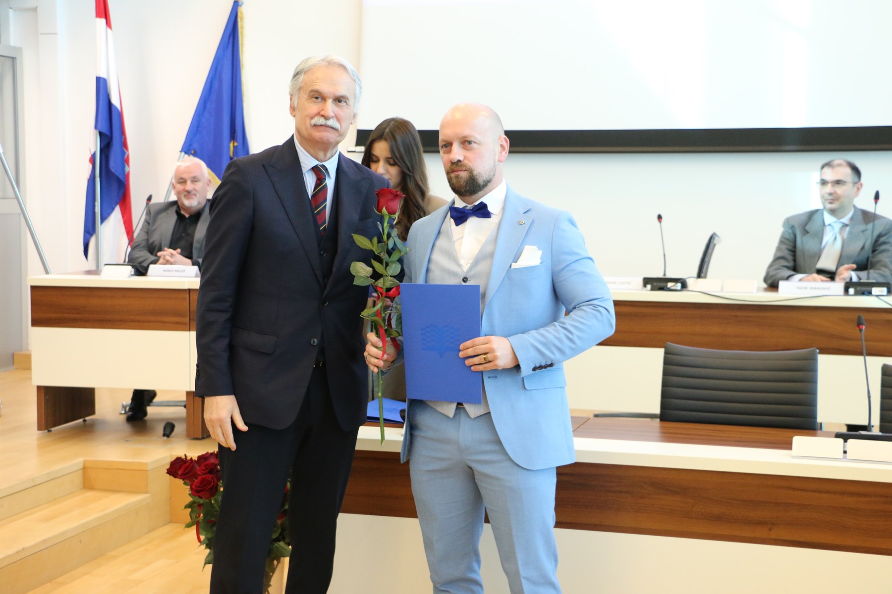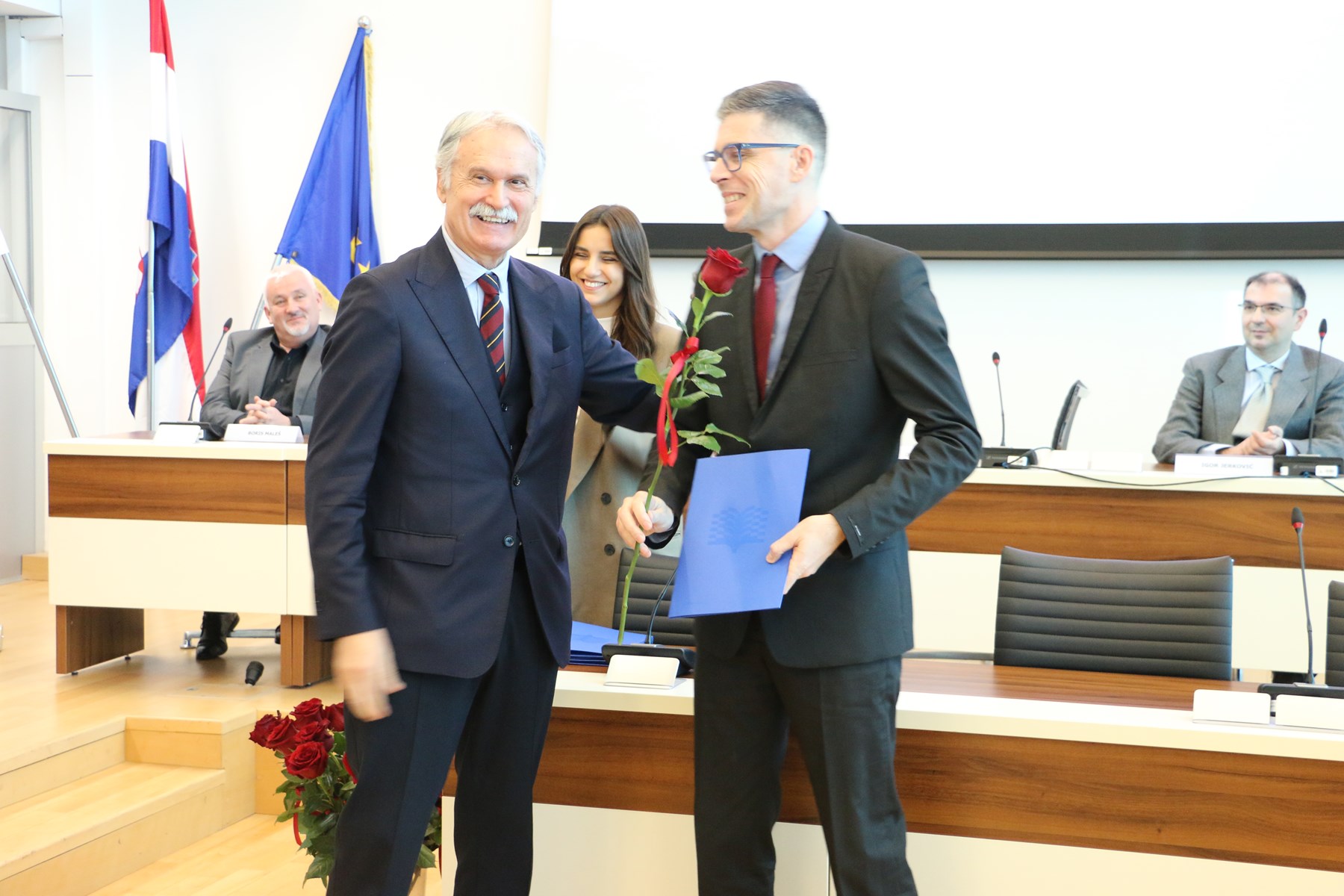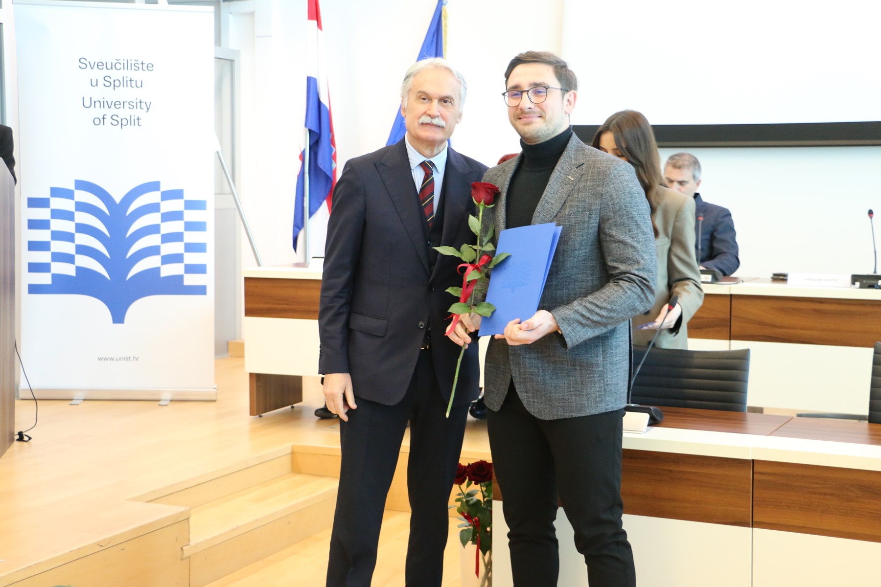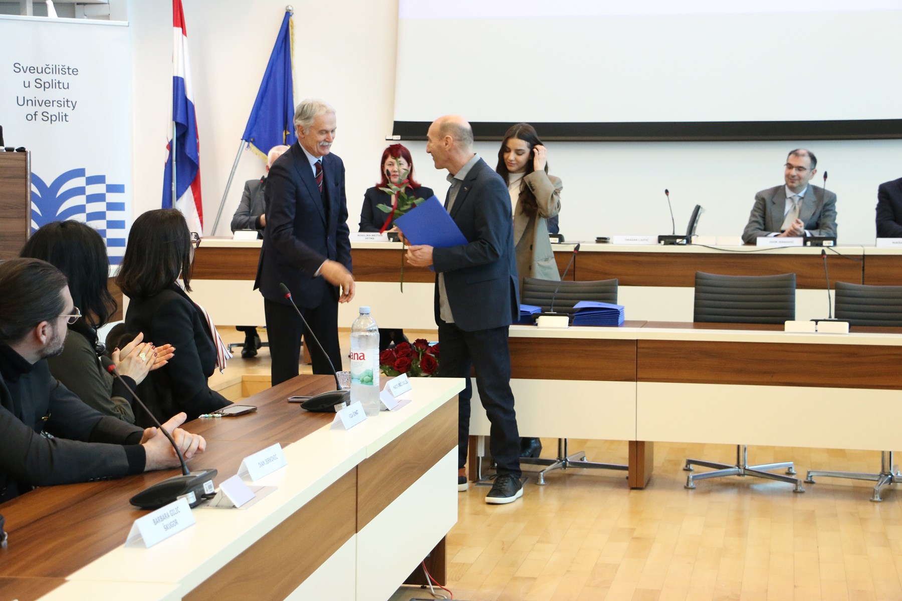U ime Splitsko-dalmatinske županije, nazočnima se obratio Tomislav Đonlić, pročelnik Upravnog odjela za prosvjetu, koji je izrazio zadovoljstvo ispunjenom dvoranom i kontinuiranim rastom Sveučilišta u Splitu. Istaknuo je kako vrhunska znanost i sudjelovanje u međunarodnim projektima pridonose ugledu Sveučilišta, ali i grada i županije, naglasivši važnost uspješne i dugogodišnje suradnje Županije i Sveučilišta. Nagrađenim znanstvenicima poželio je da ih entuzijazam i ljubav prema znanosti i dalje vode u profesionalnom i osobnom razvoju.