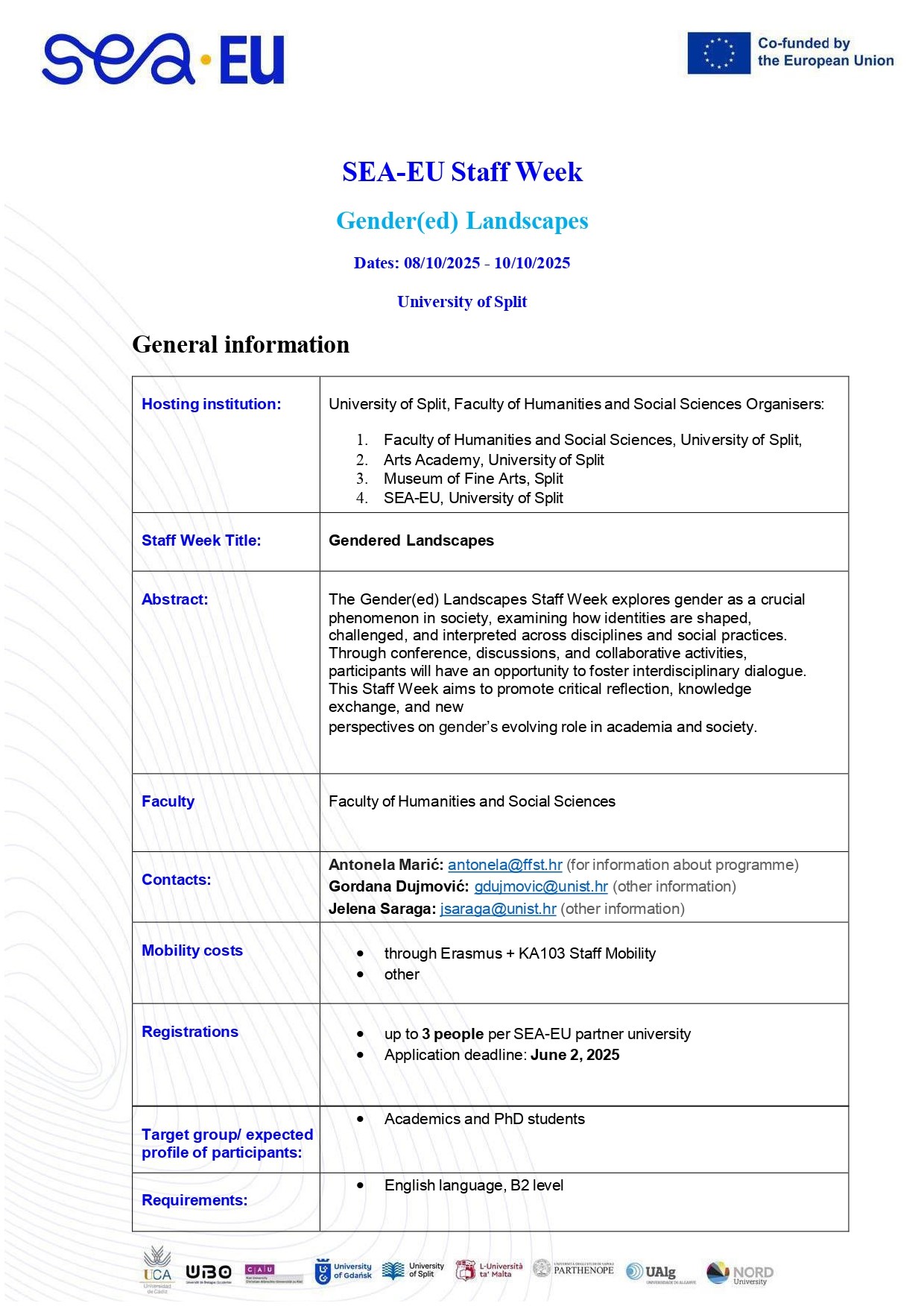Na Filozofskom fakultetu u Splitu će se od 08.10. 2025.- 10.10.2025. održati Staff week u okviru SEA EU projekta, radnog paketa 4.1. Gender and Inclusion. Sudionici staff weeka će kroz različite aktivnosti imati prigodu razgovarati o projektnim temama i budućim inicijativama, a sudjelovat će i na kratkom tečaju hrvatskog jezika. Panel rasprava i radionica Feminist City prethodit će međunarodnoj znanstvenoj konferenciji Gender(ed) Landscapes: Reframing Identity Across Art, Science and Society, koja će se održati dana 09.10. i 10.10.2025.