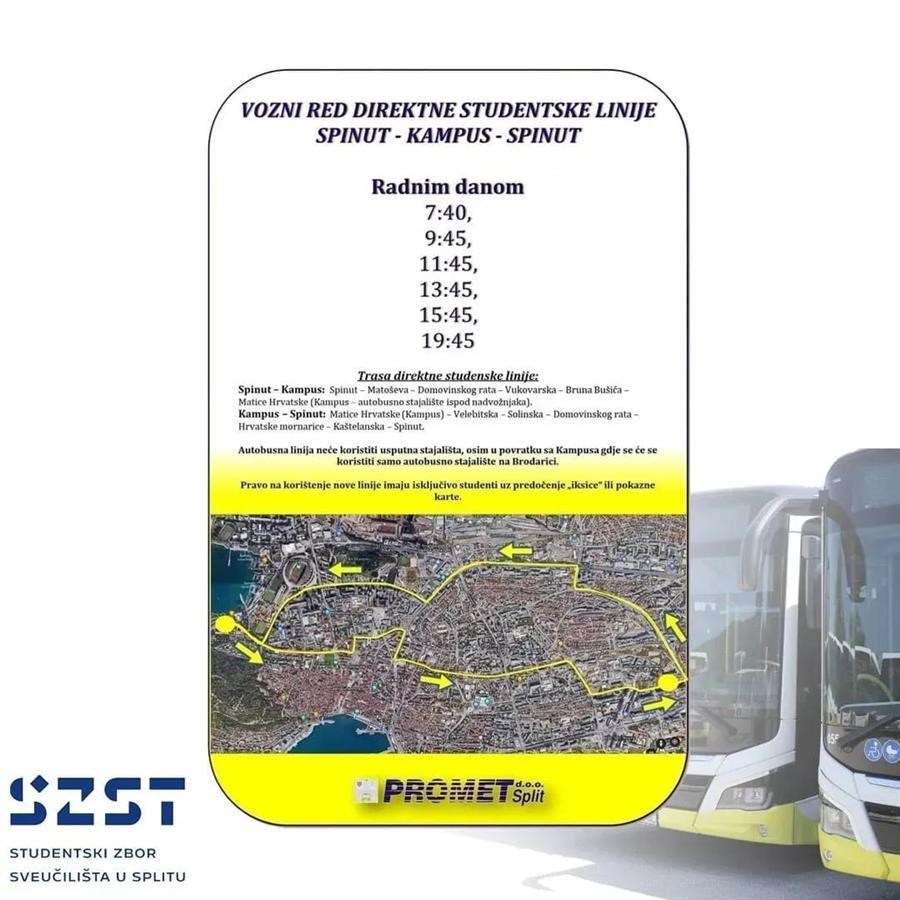 Izvrsne vijesti za studente Sveučilišta u Splitu! Posebice one koji žive u studentskim domovima na Spinutu obradovat će vijest da će se i nadalje moći besplatno voziti posebnom autobusnom linijom koja će prometovati na relaciji od Spinuta do Kampusa.