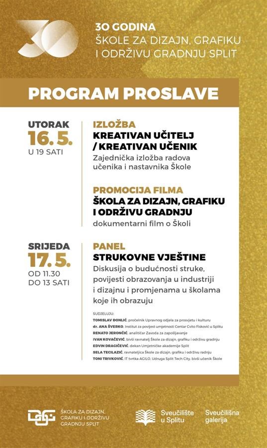 U prigodi obilježavanja 30. godišnjice osnutka Škole za dizajn, grafiku i održivu gradnju, u utorak, 16. svibnja s početkom u 19 sati u Sveučilišnoj galeriji otvorit će se izložba "Kreativan učitelj/kreativan učenik", a bit će prikazan i dokumentarni film o Školi.
